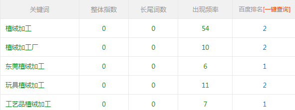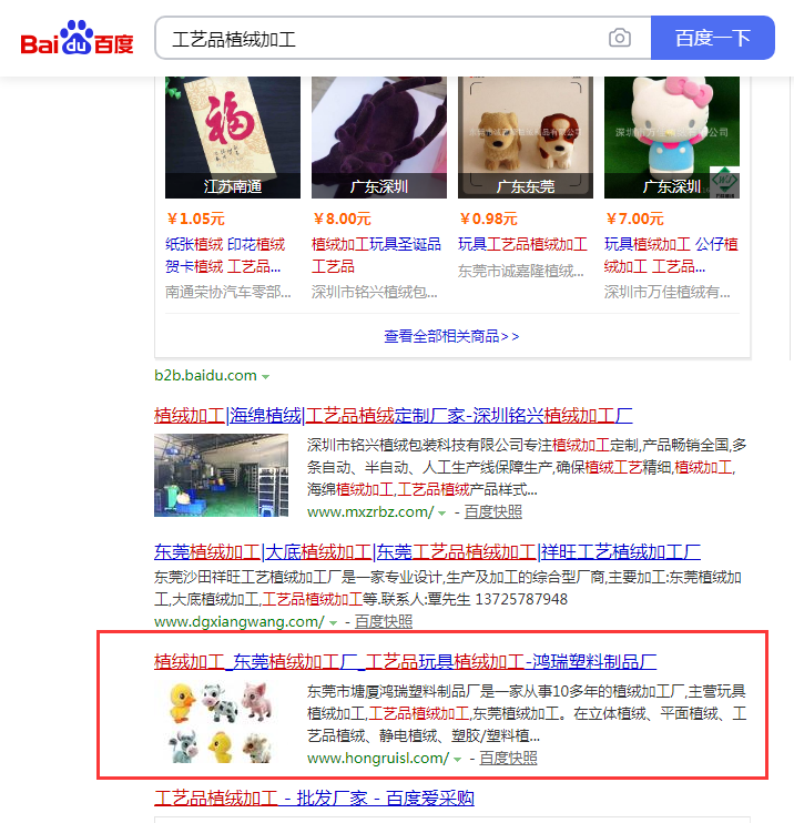鸿瑞塑胶主要优化关键词本来是4个,通过技术专员的操作,3个月内把包括最主要的“植绒加工”在内的近20个关键词优化到了首页,网站优化效果让客户满意。