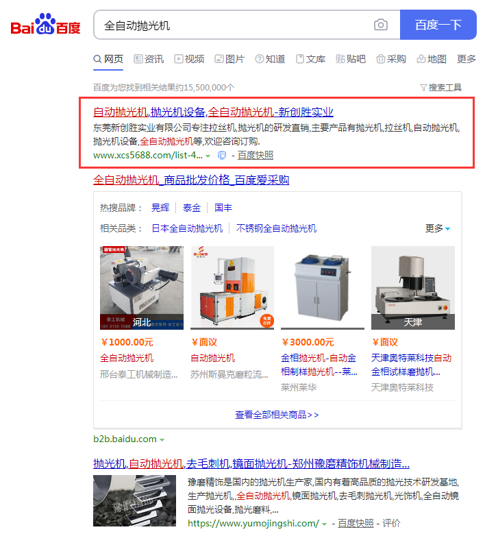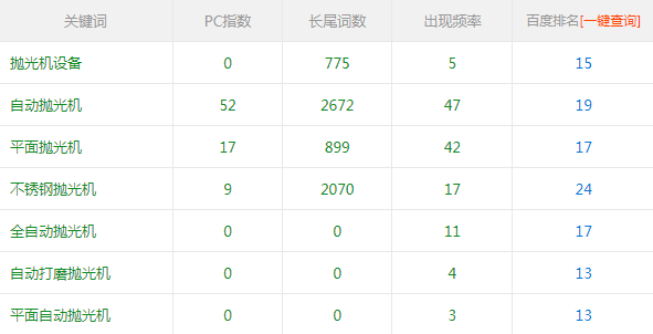 新创胜机械的产品主要是抛光机和拉丝机,我们通过分析用户搜索习惯和数据,确定从产品词入手,流量词和咨询词相结合,分成两个网站进行布局优化,经过一段时间的优化推广,主要关键词全部排名首页,并且有大量的长尾词也排名首页,长期保持稳定,大大提高曝光量和点击量。