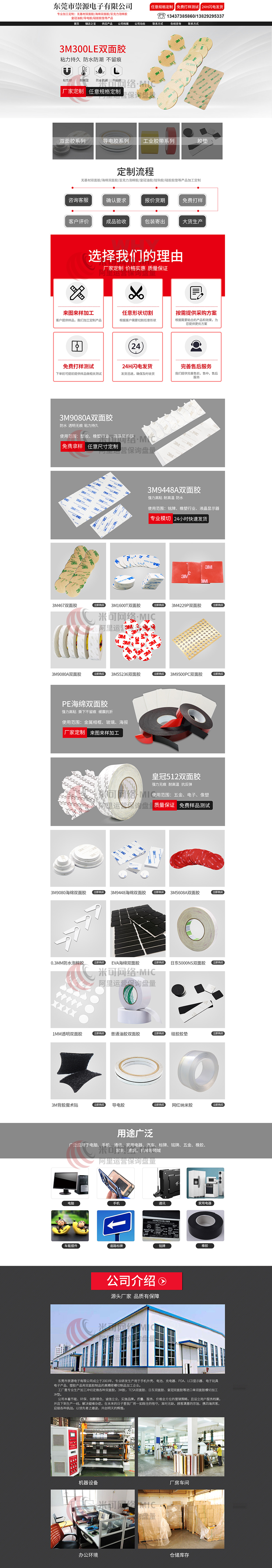 东莞市崇源电子有限公司是专业生产无基材双面胶,海绵双面胶,亚克力泡棉双面胶等背胶制品的实力厂家。页面主色调以红色为主,简约大气,突出产品特点。在公司优势上,我们从工厂的专业生产设备、厂房车间、产品库存以及办公环境等进行展示,体现我们是专业的生产厂家。在产品上,除了对产品特点基础介绍之外,还应该突出我们非标定制的服务优势,如任意形状定制、免费拿样、来图来样加工、当天发货以及针对客户需求提供采购方案等优势,从而在专业和服务上吸引客户询盘成交。