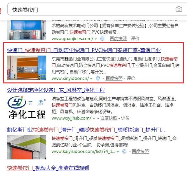 网站SEO优化效果:长尾词关键词快速卷帘门、PVC快速门、自动快速门、钢制洁净门、快速门厂家等20多个词排名在首页,网站综合权重2。