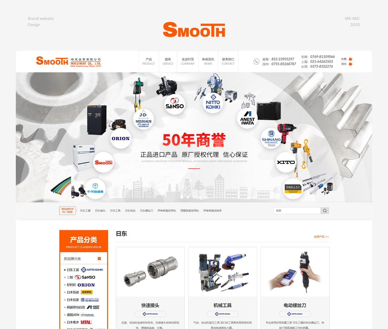 时茂品牌设计网站建设,网站在设计元素上突出了客户50年的商誉品牌实力,客户主要做代理的产品,在产品分类部分采用多级别分类的展示模式,先展示品牌然后再展示品牌下面对应的产品,让用户更清晰的了解到各个品牌的产品信息,同时网站还在产品详情关联了相关应用,让客户更清楚的了解产品的用途
