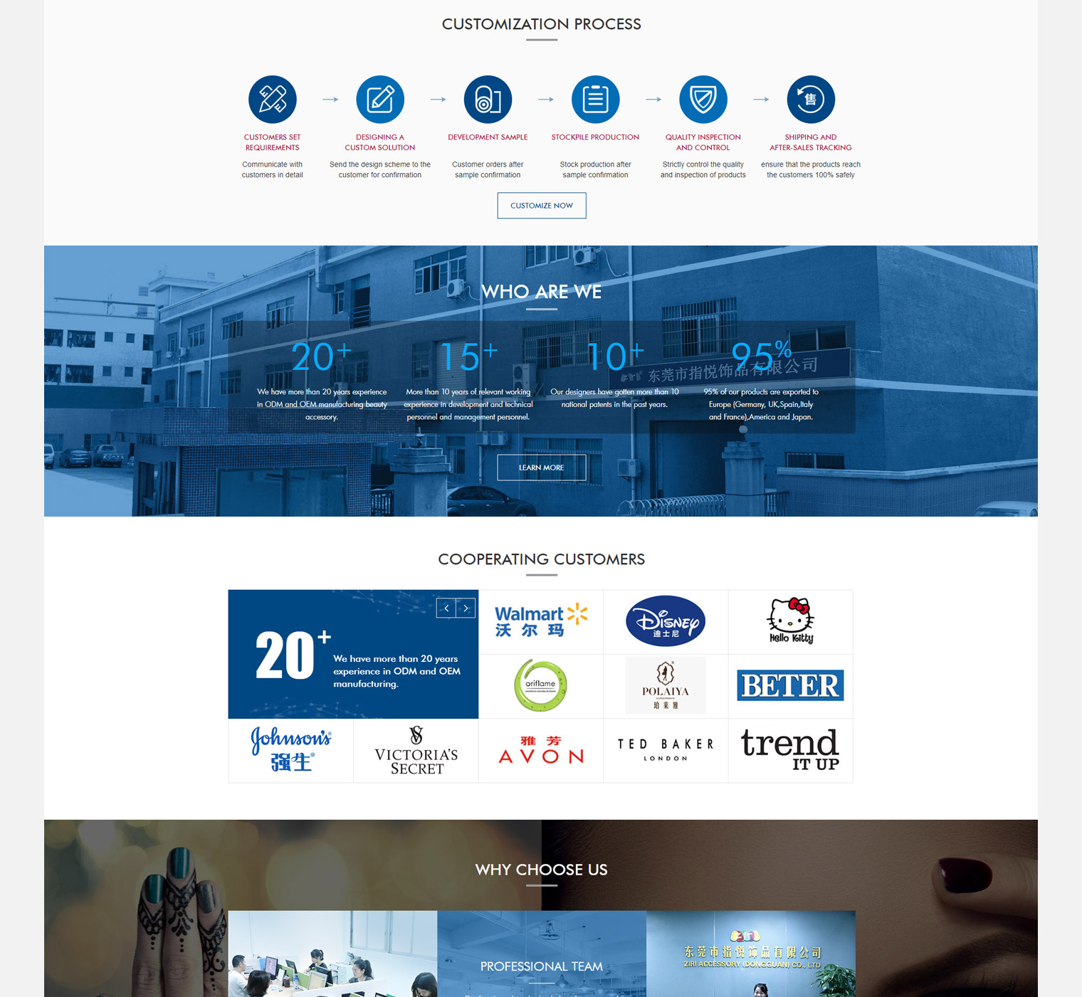 指悦饰品是做美容美甲工具的,产品95%的份额出口至欧洲(英国,德国,西班牙,意大利与法国)美国以及日本,网站用做谷歌推广,所以优化功能比较重视;对产品、公司实力、规模的展示需要达到国际范的审美标准。我们针对客户的产品图片和厂房图片进行了精修,保证整个网站看上去高端、大气、国际化,对产品的详情页也做了相对应的定制化设计,保障整个网站的逻辑性、美观性。