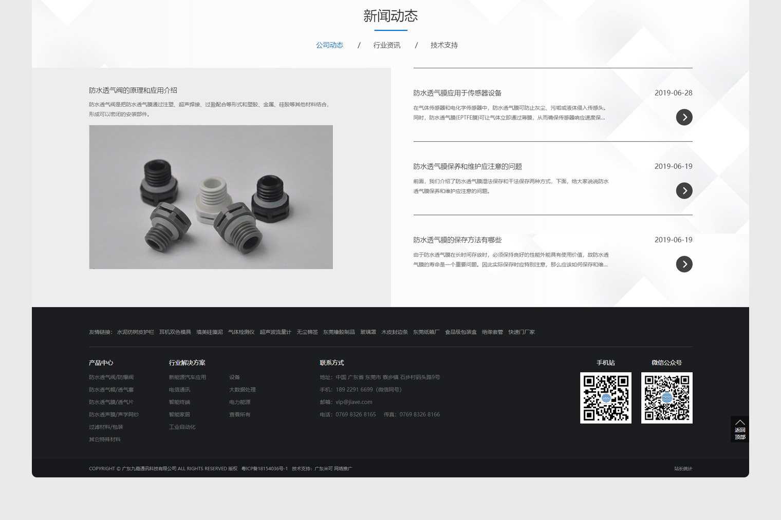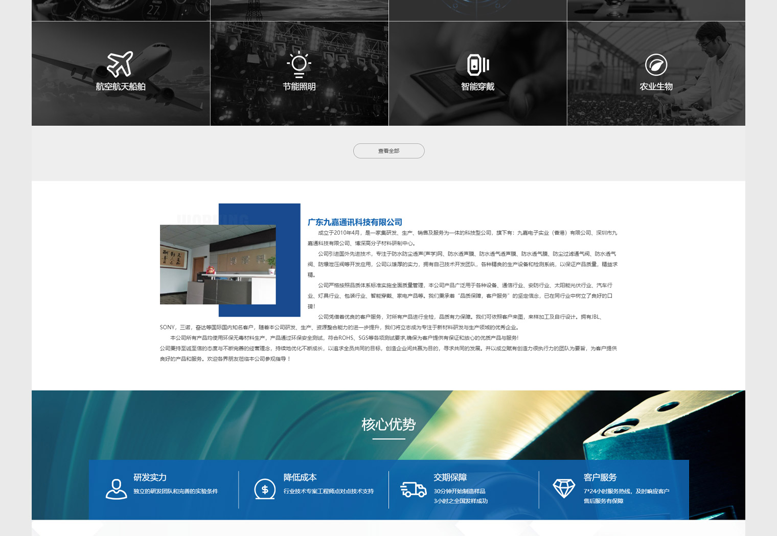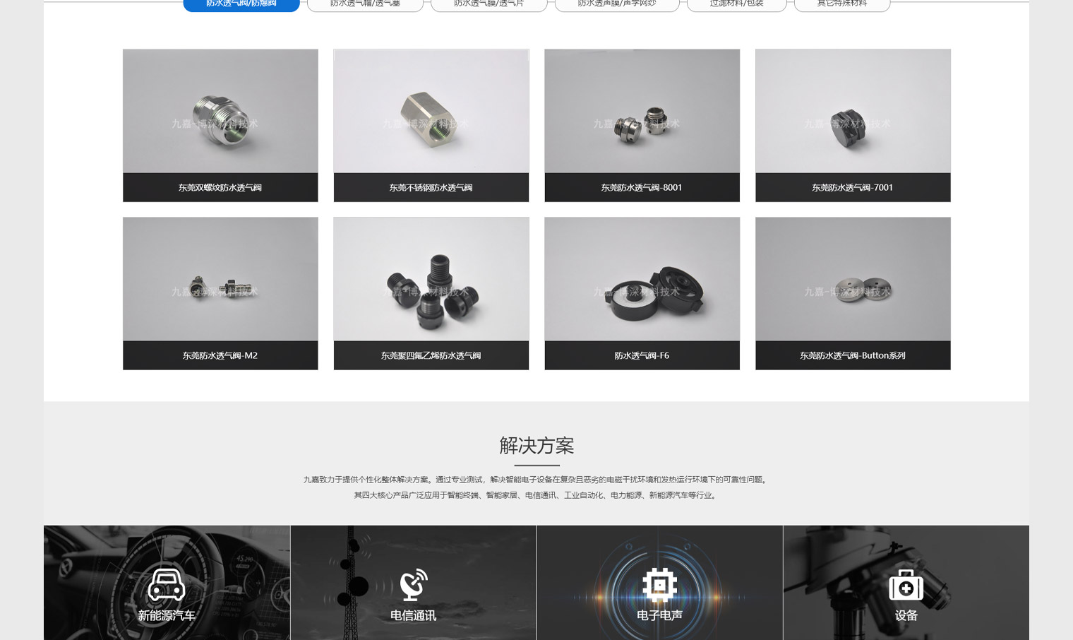 九嘉通信以防水材料为主,产品应用行业广泛,网站建设结合推广需求及客户转化率对网站整体进行内容布局设计,进入网站以各类型产品为主(选项卡切换)解决客户需求问题,同时引导客户对应行业应用进行说明,突出了公司的特色优势:制造业的交期、产能、研发及品控;网站设计上采用宽屏设计,突出科技感。