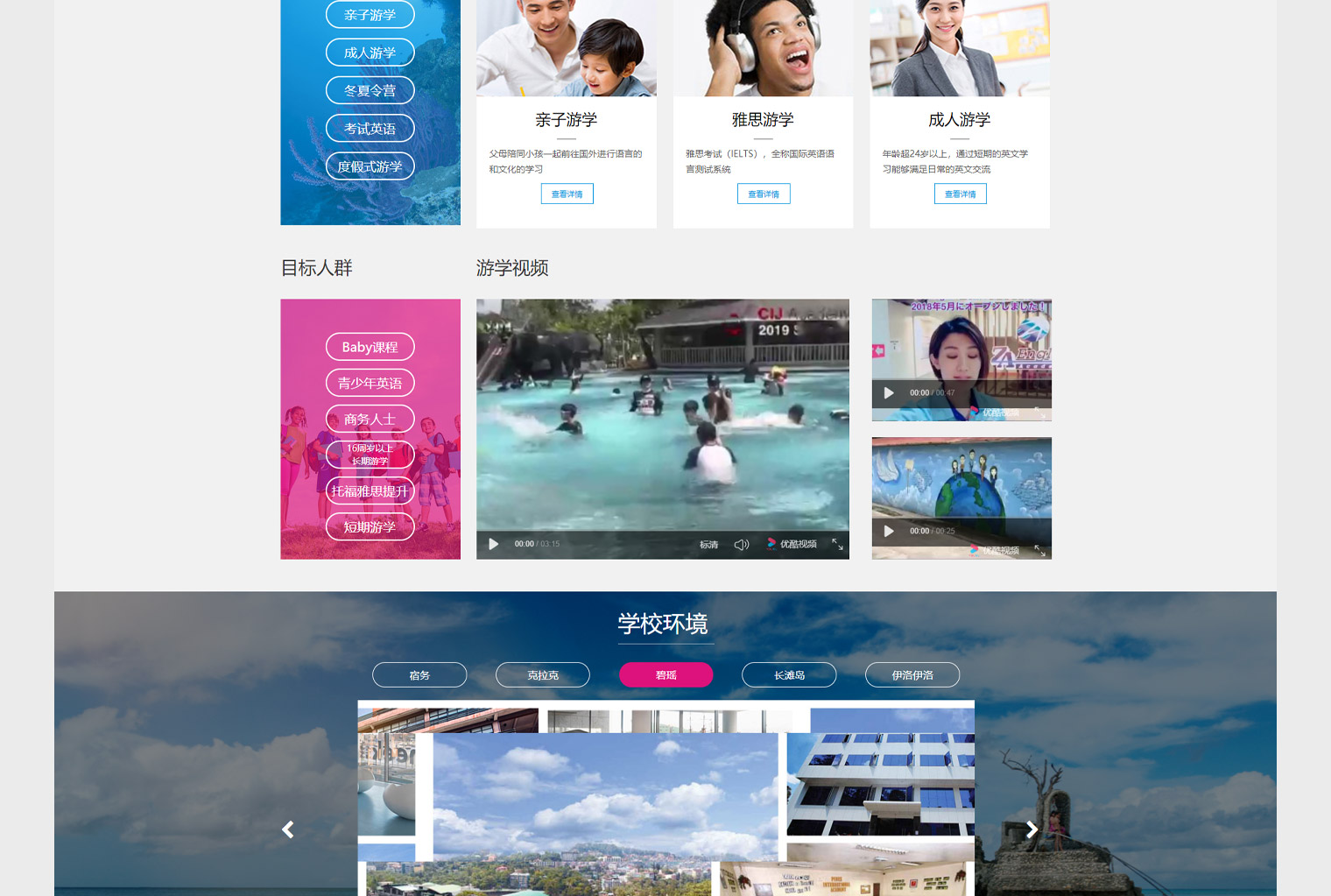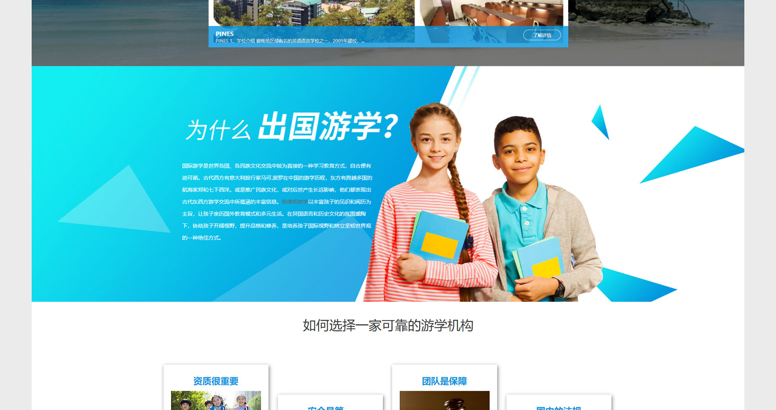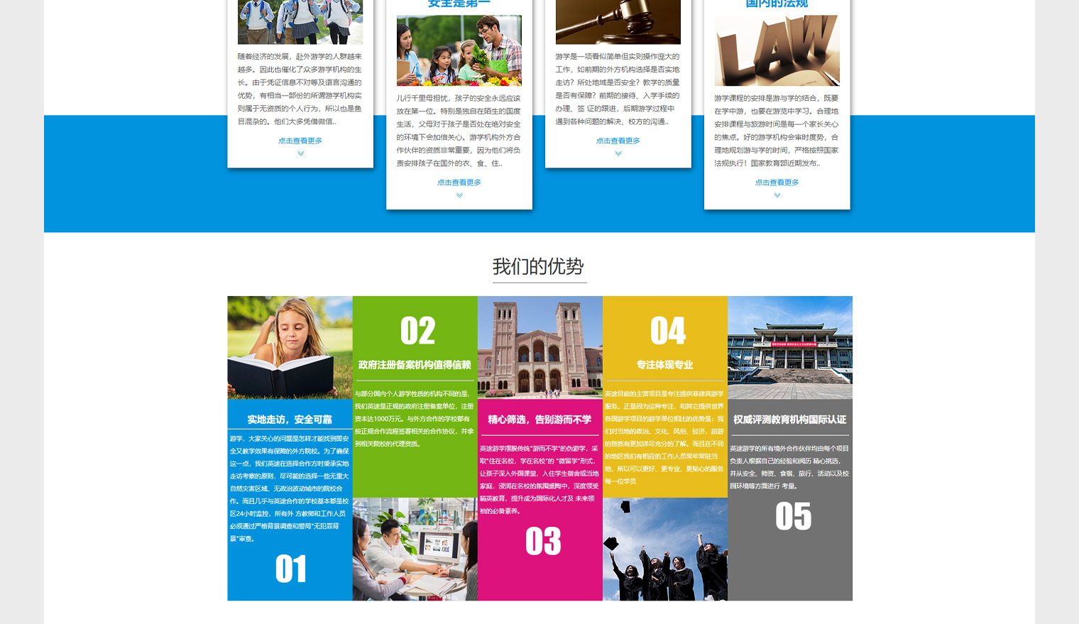英途网站设计结合行业特性使用浅色调,内容布局以课程,学校,公司优势,游学的好处为主,内容更多的是在传递游学对于子女教育的影响,通过体验国外的生活。