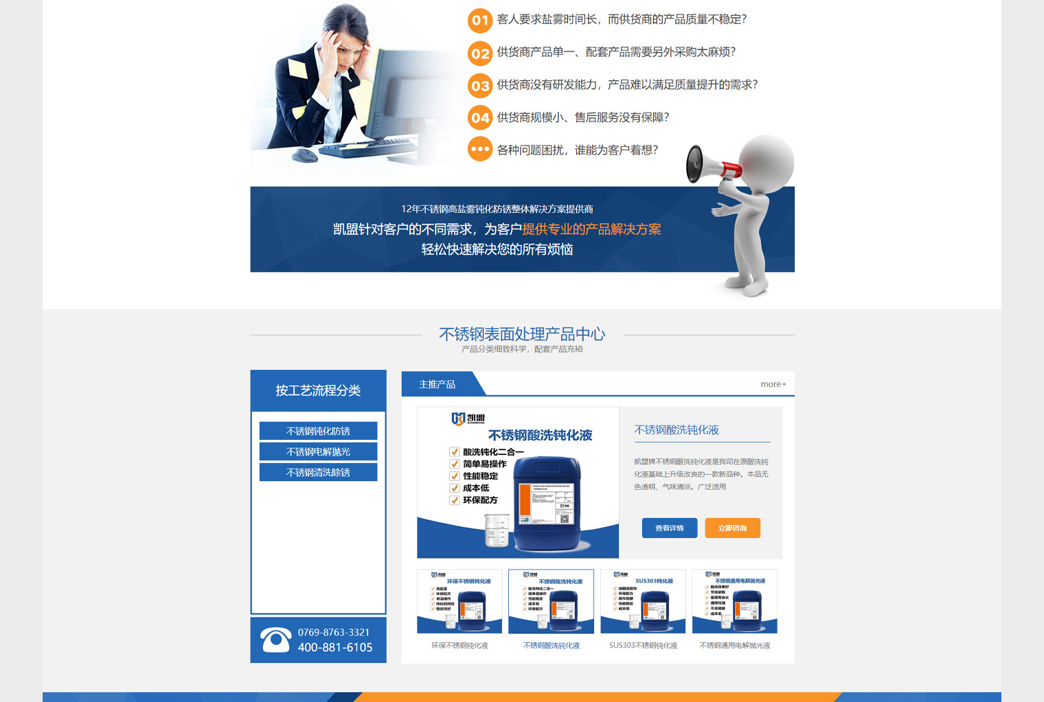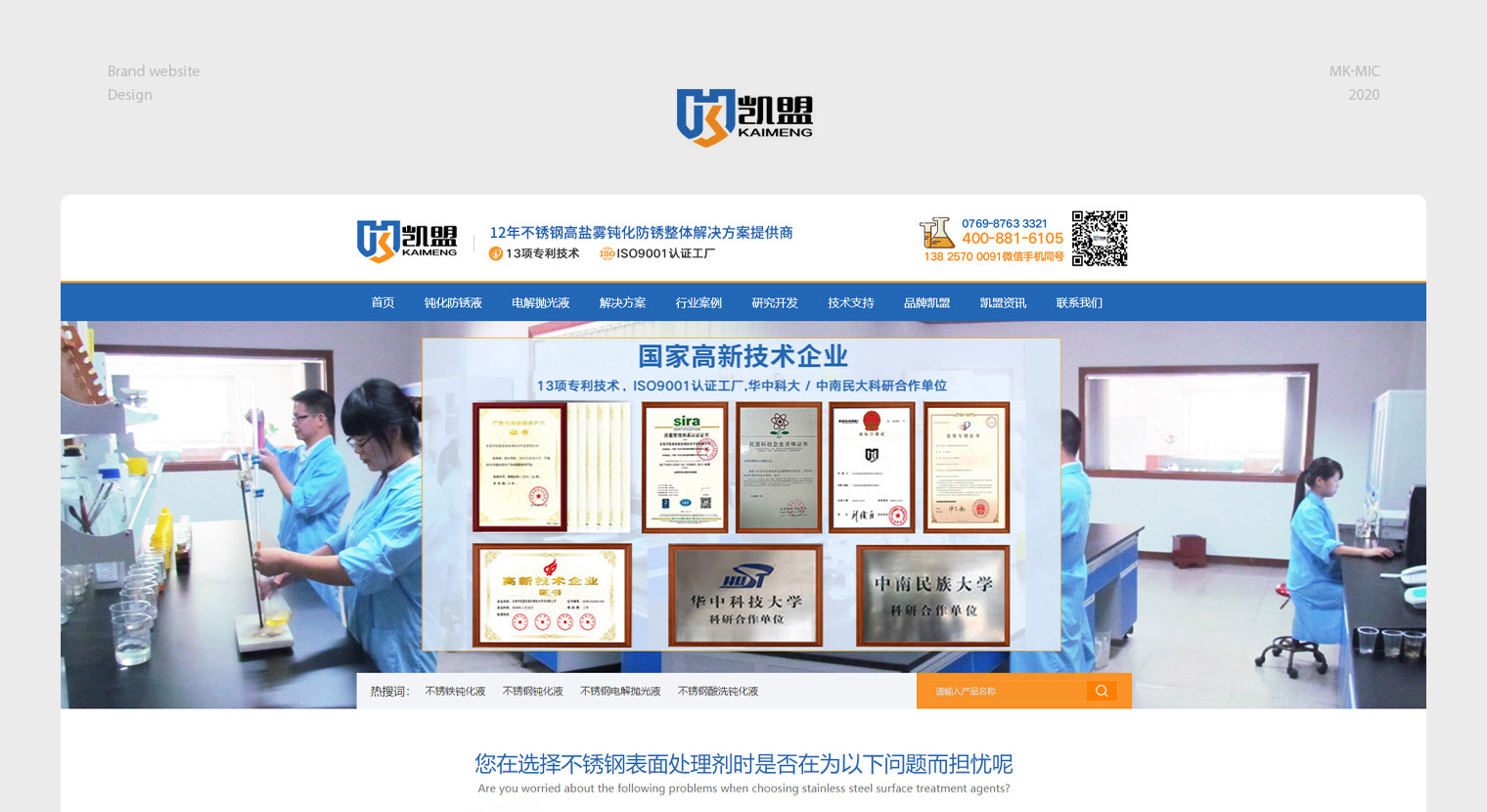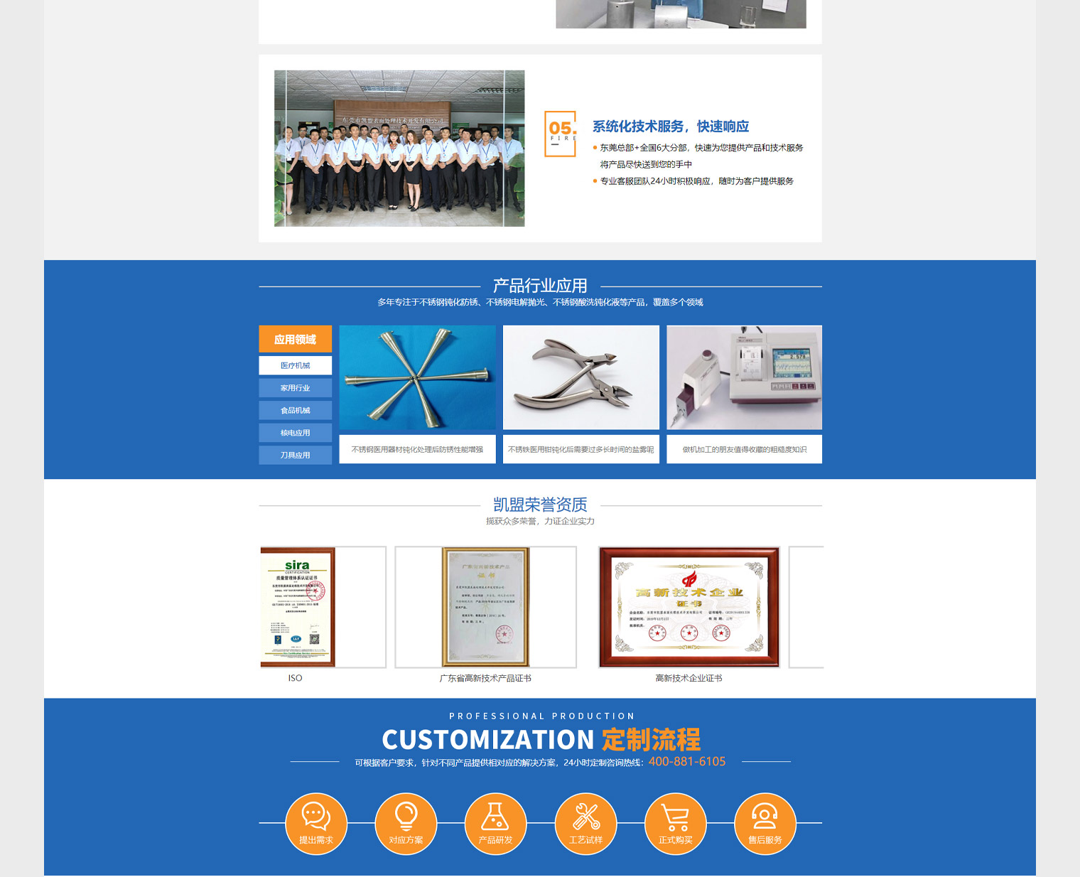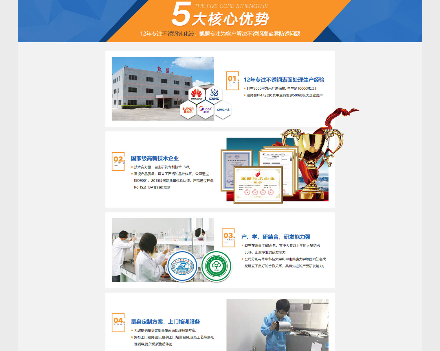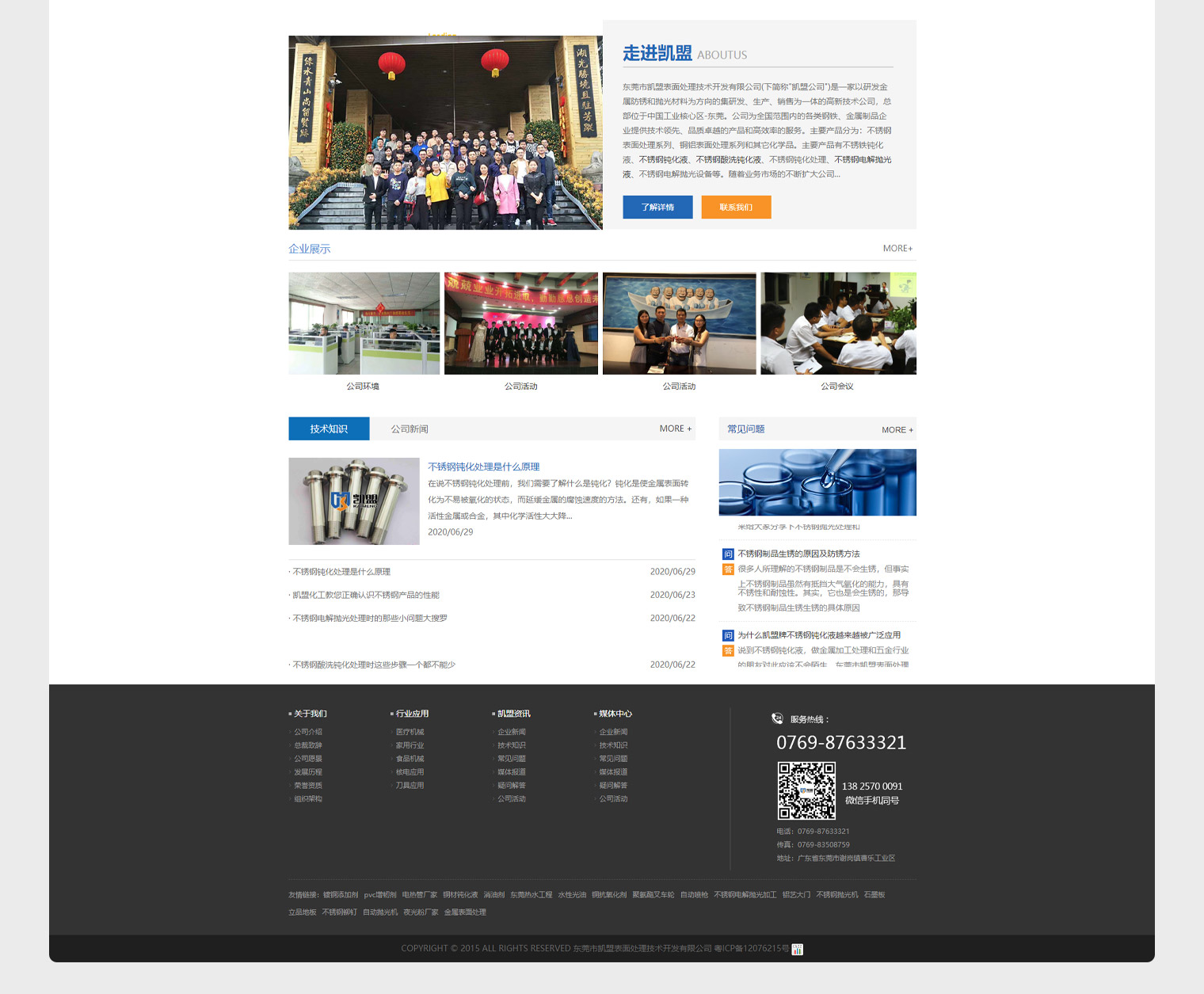 东莞市凯盟表面处理技术开发有限公司是一家以研发金属防锈和抛光材料为方向的集研发、生产、销售、服务为一体的高新技术公司,且12年研发、生产经验,拥有完善的检测设备及与各种仪器及专业的管理人员。蓝绿主色调对比搭配符合行业调性同时让整个网站显得干净大气。更符合网站销售产品的视觉效果。